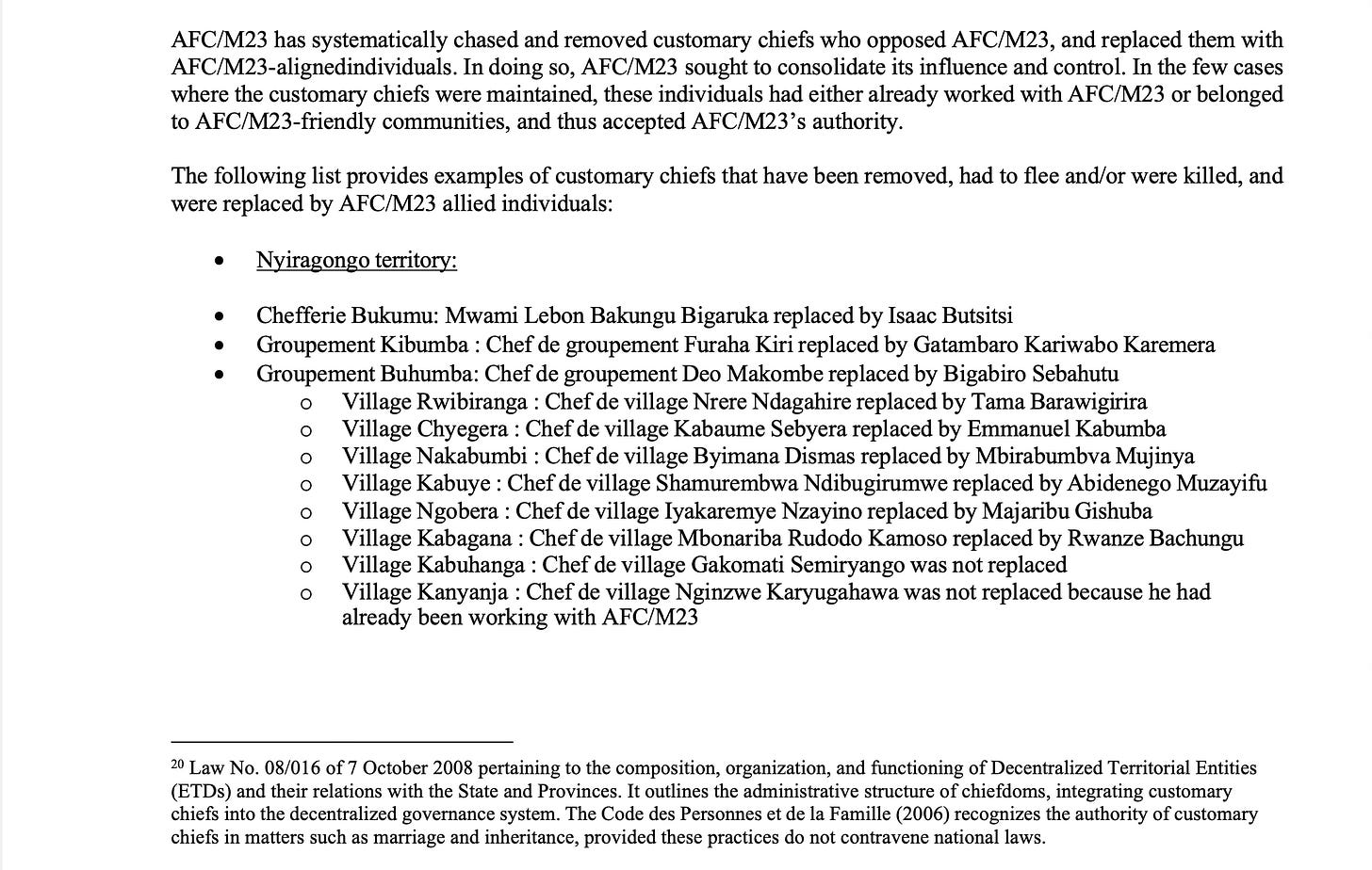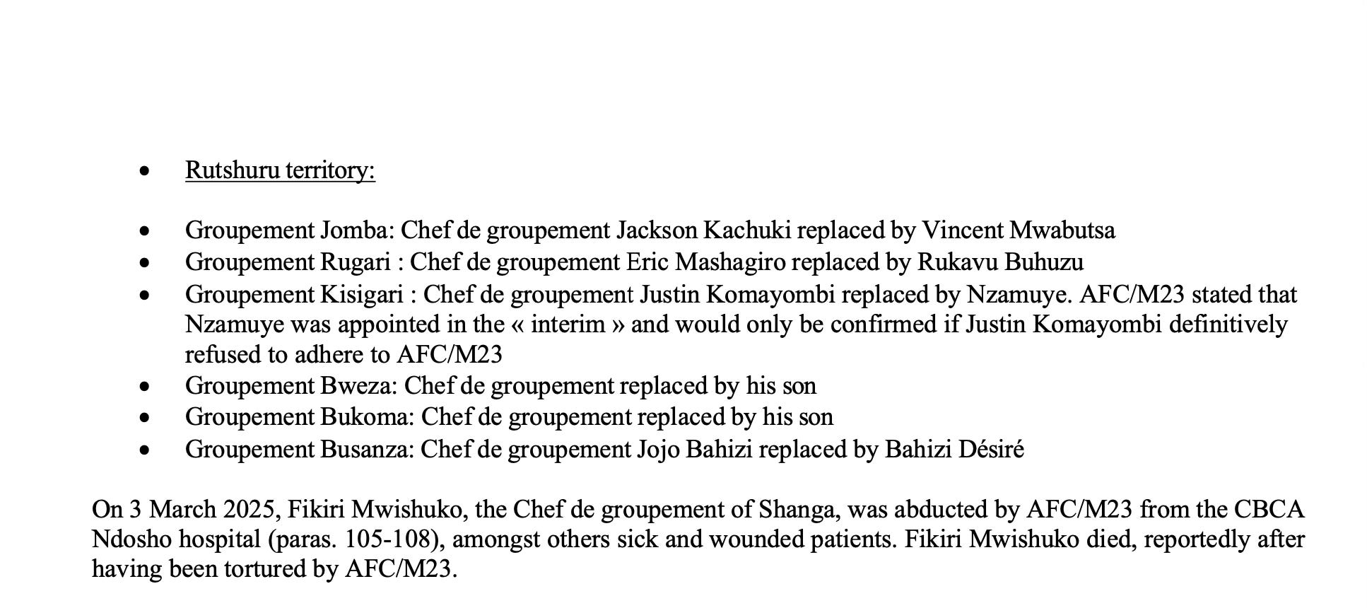 Particularly disturbing are the number of customary chiefs which the M23 has removed and replaced since January this year, thus also carrying out policies that attempt to erase the social fabric of Congolese communities living in the east. An extract of the UN Experts report regarding this : “For example, it (AFC/M23 ) dismantled administrative services and forcefully removed all civil servants who did not adhere to AFC/M23. Similarly, it systematically tracked, intimidated and substituted legally appointed customary chiefs, and threatened civil society leaders. Ephrem Kabasha, AFC/M23 territorial administrator of Nyiragongo, abducted and tortured several civil society leaders. Corneille Nangaa, Bertrand Bisimwa, Bahati Erasto, Willy Manzi, Ndayambaje and Vianney Kazarama seized and redistributed public and private properties, targeting civil society leaders in particular. AFC/M23 systematically occupied public buildings and destroyed archives aimed at erasing institutional memory and evidence of land tenure, notably in view of the return from Rwanda to North and South Kivu of all Congolese refugees (annex 17).”