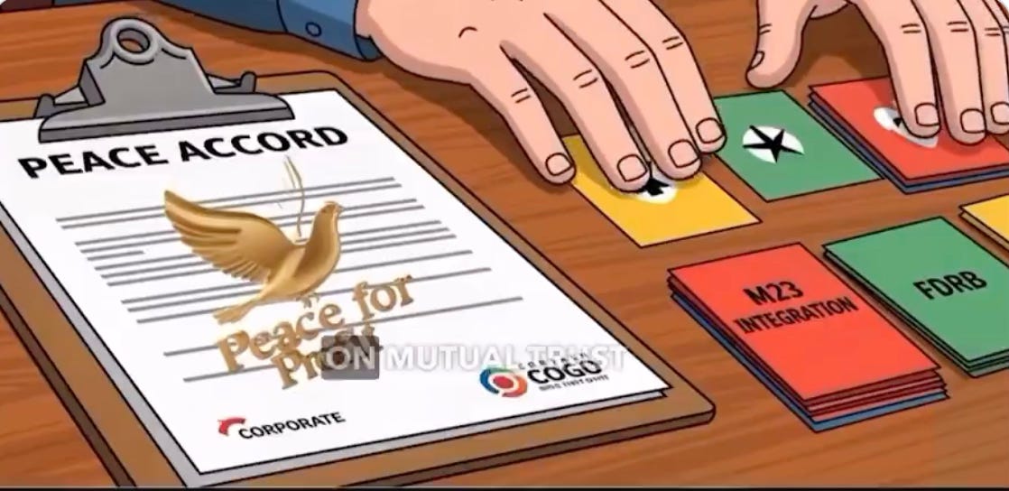 The comic strip video on this peace accord has the Congolese diplomat saying:“ This is not peace, it’s the formalization of an occupation, you have turned plunder into policy and called it regional cooperation.” “After invading the land they sit on I get to manage the Congolese parks and minerals”, says the Rwandan diplomat in the cartoon, reflecting the widely-held opinion that the accord awards Rwanda, as it whitewashes its crimes.